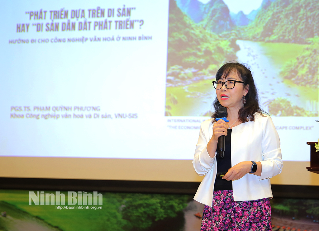 Bằng cách phân tích cách di sản đóng vai trò vừa là khuôn khổ hướng dẫn vừa là mục tiêu cuối cùng cho phát triển, PGS.TS Phạm Quỳnh Phương, Trưởng Khoa Công nghiệp văn hóa và Di sản, Trường Khoa học liên ngành và Nghệ thuật, Đại học Quốc gia Hà Nội đề xuất: cần để di sản dẫn dắt phát triển thay vì phát triển dựa trên di sản thông qua việc thúc đẩy các ngành công nghiệp văn hóa, cân bằng giữa bảo tồn và thương mại hóa, đảm bảo sự tham gia của cộng đồng địa phương và tạo ra các chính sách duy trì di sản trong khi thúc đẩy lợi ích kinh tế.