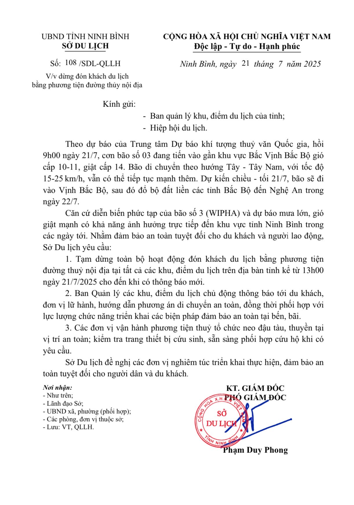 Trước diễn biến phức tạp của cơn bão WHIPHA, dự báo có mưa lớn và có khả năng ảnh hưởng trực tiếp đến khu vực Ninh Bình trong các ngày tới, Sở Du lịch vừa ban hành văn bản số 108/SDL-QLLH về việc dừng đón khách du lịch bằng phương tiện đường thủy nội địa trên địa bàn tỉnh để gửi Ban quản lý khu, điểm du lịch, Hiệp hội du lịch nhằm đảm bảo an toàn tuyệt đối cho du khách và người lao động kể từ 13h ngày 21/7/2025 cho đến khi có thông báo mới.
