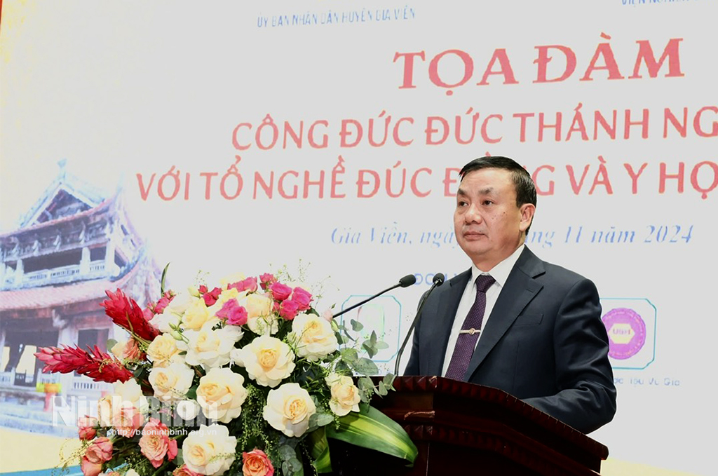Đồng chí nhấn mạnh: Để phát huy các giá trị di sản lịch sử văn hóa liên quan đến Đức Thánh Nguyễn gắn với tri thức bản địa, nhằm thúc đẩy phát triển kinh tế-xã hội địa phương, huyện Gia Viễn cần quan tâm ở trên hai phương diện là nền tảng di sản và đổi mới sáng tạo, ứng dựng phát huy giá trị di sản trong đời sống, nhất là nhận diện, khai quật được di sản đó. Đồng thời, bảo tồn, gìn giữ và phát huy giá trị của di sản, làm di sản có sức sống.
