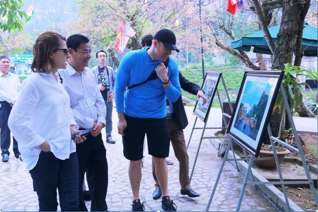 Đoàn phóng viên quốc tế ngắm nhìn những bức ảnh đẹp về Tràng An trước khi lên thuyền đi tham quan.