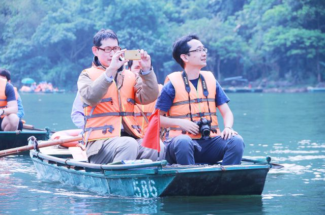 Các nhà báo Mỹ, Nhật Bản, Bồ Đào Nha… ngồi thuyền tham quan di sản Tràng An.