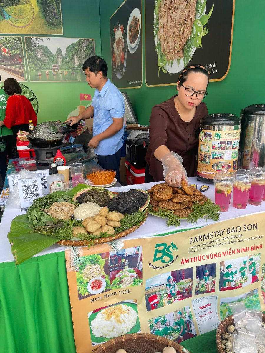Gian hàng không chỉ đẹp mắt mà còn giàu trải nghiệm. Du khách được thưởng thức các sản vật trứ danh như cơm cháy chà bông, dê núi tiệc truyền thống, nem Yên Mạc, mắm tép Gia Thủy, … Mỗi sản phẩm đều có câu chuyện văn hóa và vùng nguyên liệu rõ ràng, làm tăng sức thuyết phục và giá trị thương hiệu.