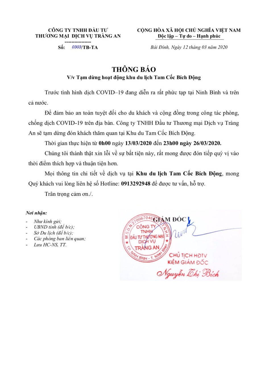 Thông báo về việc tạm dừng bán vé tại Khu du lịch Sinh Thái Tràng An