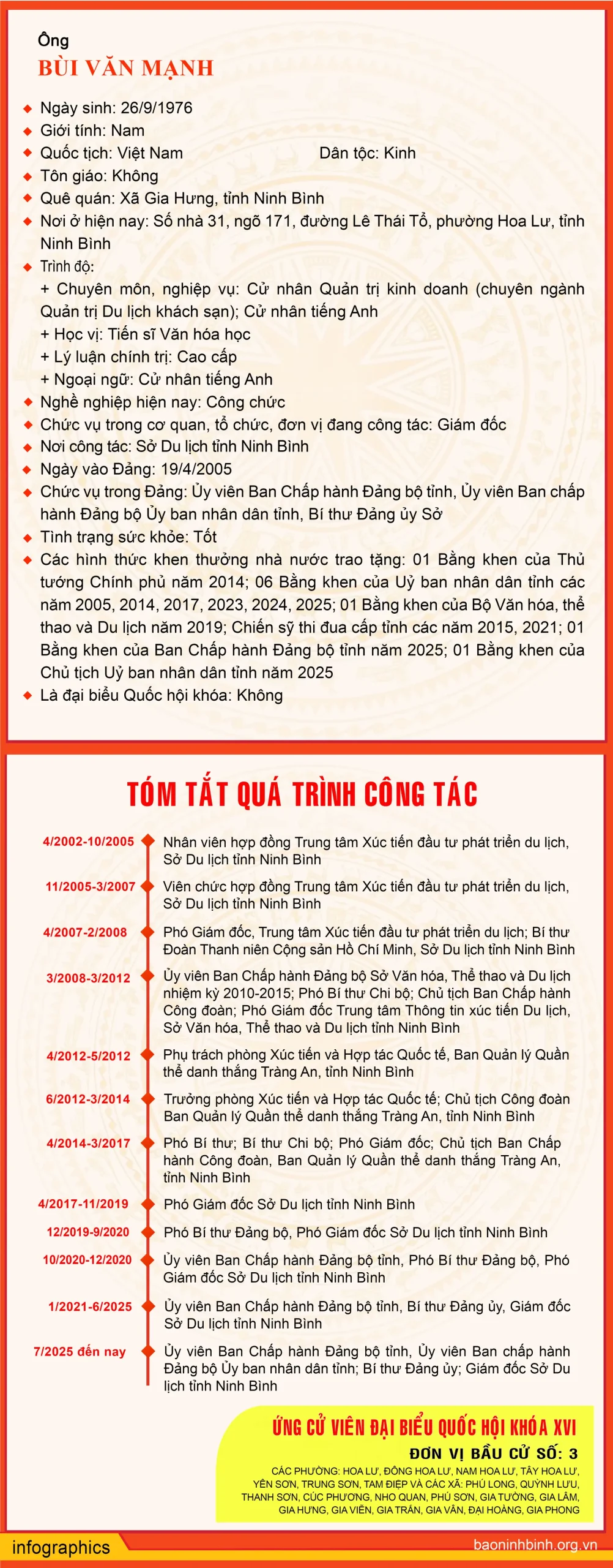 Tiểu sử ứng cử viên Đại biểu Quốc hội khóa XVI Bùi Văn Mạnh Ban Quản lý Quần thể danh thắng Tràng An trân trọng giới thiệu tiểu sử ứng cử viên đại biểu Quốc hội khóa XVI Bùi Văn Mạnh, thuộc đơn vị bầu cử số 3, tỉnh Ninh Bình. Nguồn: baoninhbinh.org.vn Các tin khácRạng rỡ “Bình minh cõi Phật” trong ngày khai hội Xuân Tam Chúc 2026 Du lịch Ninh Bình Xuân Bính Ngọ 2026: “Cú Hích” Kỷ Lục Từ Vùng Đất Di Sản Ninh Bình đón hơn 1,36 triệu lượt khách du xuân Bính Ngọ Trải nghiệm Tết Việt của du khách quốc tế Du lịch Ninh Bình hân hoan đón những vị khách đầu tiên “xông đất”