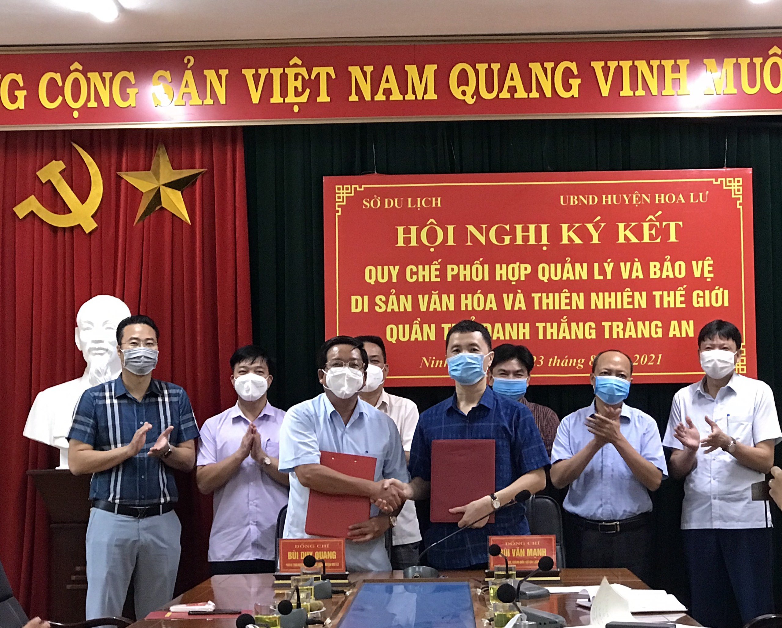 Thực hiện Kết luận số 07-KL/TU ngày 12/5/2021 của Ban Thường vụ Tỉnh uỷ và Kế hoạch số 107/KH-UBND ngày 16/7/2021 của UBND tỉnh về việc thực hiện Kết luận số 07-KL/TU tiếp tục thực hiện Nghị quyết số 02-NQ/TU ngày 17/8/2016 của Ban chấp hành Đảng bộ tỉnh về bảo tồn, phát huy giá trị Di sản Văn hóa và Thiên nhiên thế giới quần thể danh thắng Tràng An, ngày 23/8/2021 Sở Du lịch phối hợp với UBND huyện Hoa Lư tổ chức Hội nghị ký kết Quy chế phối hợp quản lý và bảo vệ di sản Văn hoá và Thiên nhiên thế giới Quần thể danh thắng Tràng An tại hội trường Sở Du lịch.