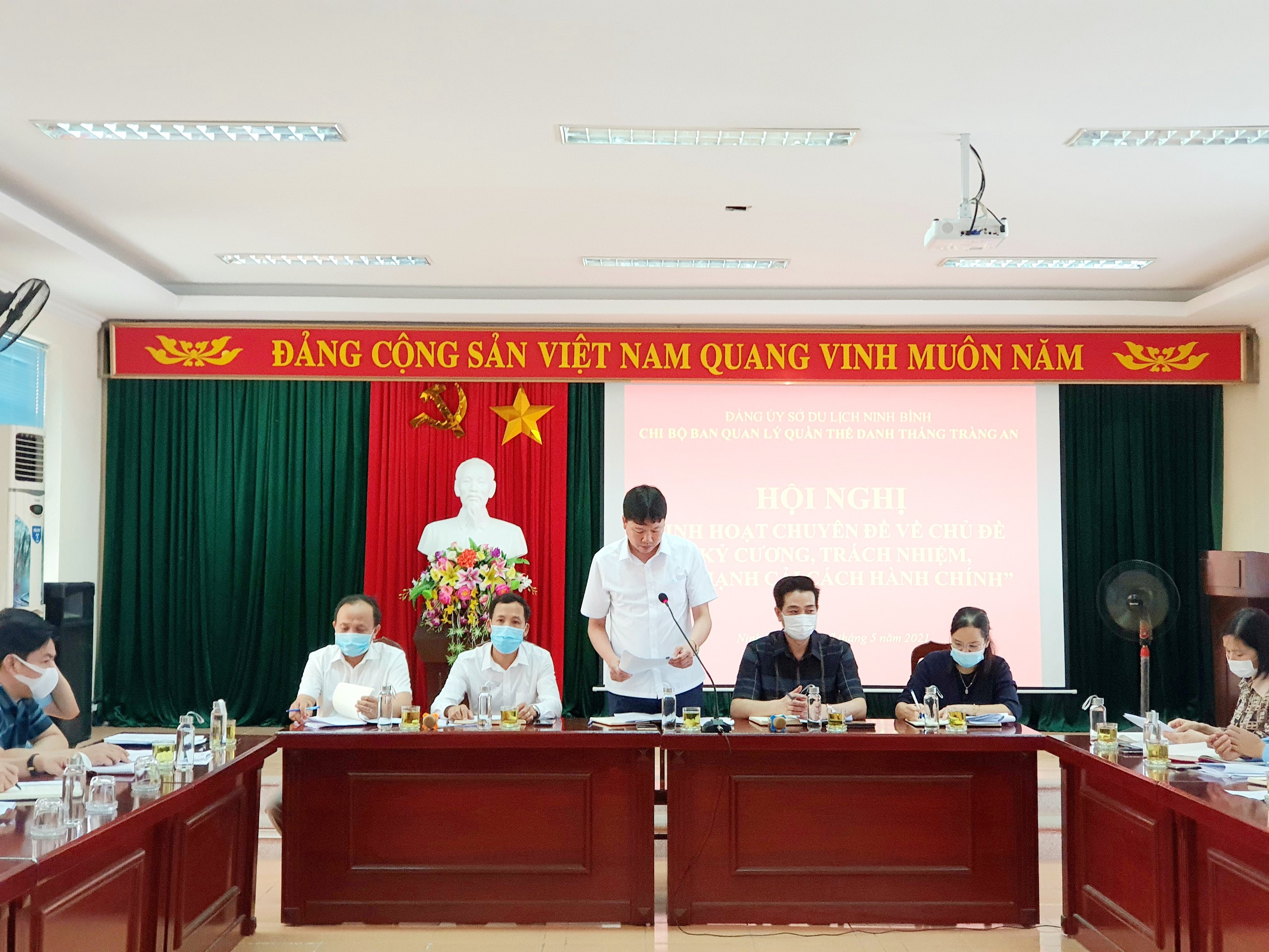 Thực hiện Kế hoạch số 12-KH/TU ngày 26/2/2021 của Tỉnh ủy Ninh Bình và Kế hoạch số 19-KH/ĐUK về triển khai thực hiện Chủ đề công tác năm 2021 của Ban Chấp hành Đảng bộ tỉnh và sự chỉ đạo của Đảng ủy Sở Du lịch, ngày 27/5/2021, Chi bộ Ban quản lý Quần thể danh thắng Tràng An tổ chức sinh hoạt chuyên đề tháng 5/2021 triển khai tổ chức thực hiện chủ đề “Kỷ cương, trách nhiệm, đẩy mạnh cải cách hành chính” theo Hướng dẫn số 08-HD/ĐUK, ngày 29/4/2021 của Ban Thường vụ Đảng ủy Khối Cơ quan và Doanh nghiệp tỉnh. Tới dự và chỉ đạo hội nghị có đồng chí Nguyễn Thị Thu Hiền, Ủy viên Ban Thường vụ, Trưởng Ban Tuyên giáo và Dân vận Đảng ủy Khối Cơ quan và Doanh nghiệp tỉnh; đồng chí Phạm Duy Phong, Phó Bí thư Đảng ủy, Phó Giám đốc Sở Du lịch; cùng toàn thể đảng viên trong chi bộ.