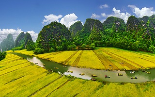 Cuối tháng 5, lúa vàng ruộm trên những cánh đồng trải dài ở khu du lịch Tam Cốc- Bích Động, nằm trong vùng lõi Di sản Văn hóa và Thiên nhiên thế giới Tràng An, thuộc huyện Hoa Lư (Ninh Bình). Đây là mùa đẹp nhất trong năm của vùng đất này.